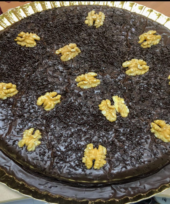 Ligue o forno a 180ºC, unte uma forma com margarina e polvilhe-a com farinha. Pique 200 g do chocolate, deite para uma tigela, junte a margarina e leve a derreter em banho-maria ou no microondas. Retire e adicione os ovos, um a um e batendo sempre. Junte o açúcar, o fermento e a farinha e bata muito bem até fazer bolhas. Adicione o miolo de noz picado, envolva, deite na forma e leve ao forno durante cerca de 45 minutos ou até que fique cozido. Retire, desenforme e deixe arrefecer. Entretanto, ferva as natas num tacho, retire do lume, junte o restante chocolate picado e mexa bem. Barre o bolo com este creme, deixe secar e sirva decorado com mais nozes. Pode polvilhar com açúcar em pó.
