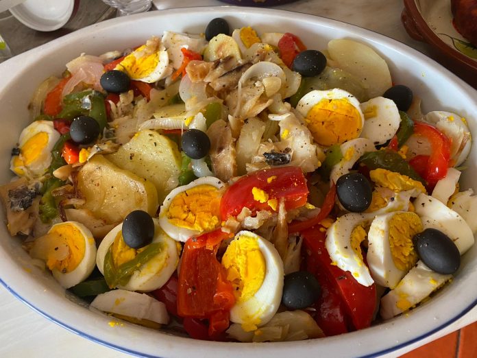 - ) Delicamente monte a última camada, acrescendo os ovos cozidos e as azeitonas pretas, abusando do azeite de oliva até que o fundo complete a metade da altura da travessa.