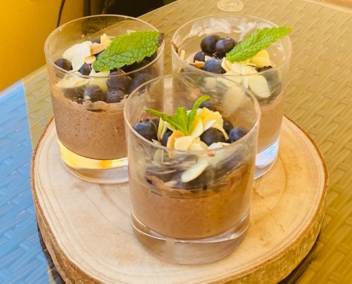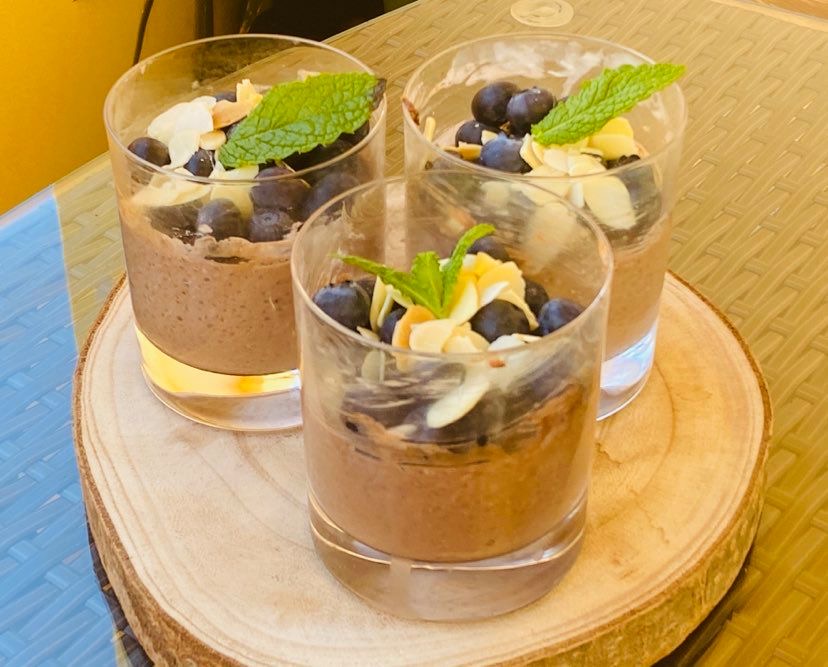 Em cada copo individual misture o leite de coco, a chia e o cacau.