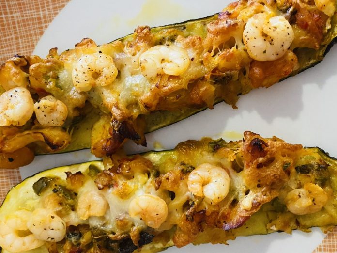 Recheie as courgettes, e leve ao forno até ganha consistência polvilha com queijo ralado mozarela e oregãos, decore com os camarões e leva ao forno a gratinar.