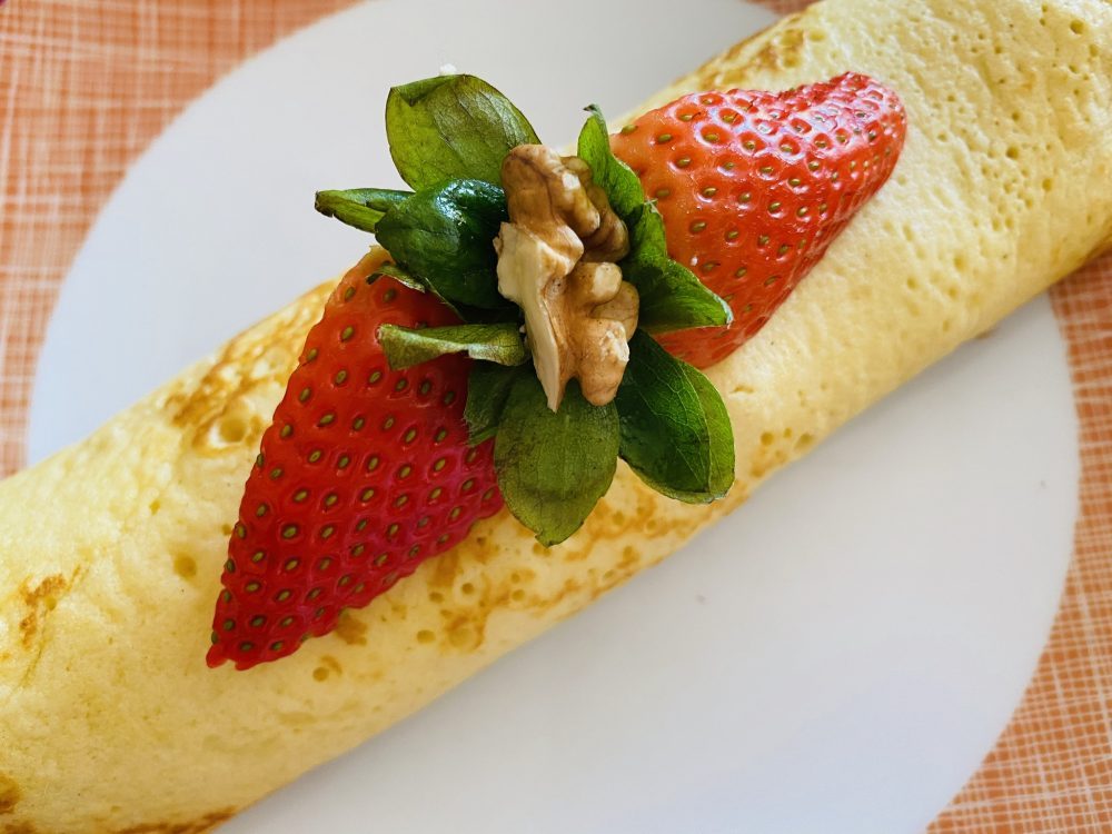 Lave os morandos e corte-os envolva-os com o queijo e as nozes, coloque-os no centro do crepe e enrole, para fazer um rolinho. Nas pontas coloque um morango para o recheio não sair para fora, e decore a gosto com morangos mel e nozes.