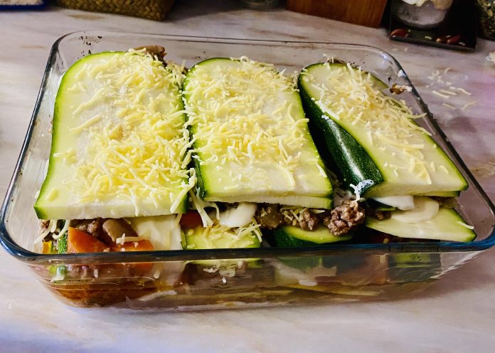 Num tabuleiro que possa ir ao forno colocar uma camada de courgette seguida de um camada de carne e de queijo ralado, e o molho bechamel. Repetir com mais uma camada de courgette, carne e queijo e molho bechamel (as camadas vão depender da quantidade que fizerem). Terminar com uma camada de courgette e queijo ralado.