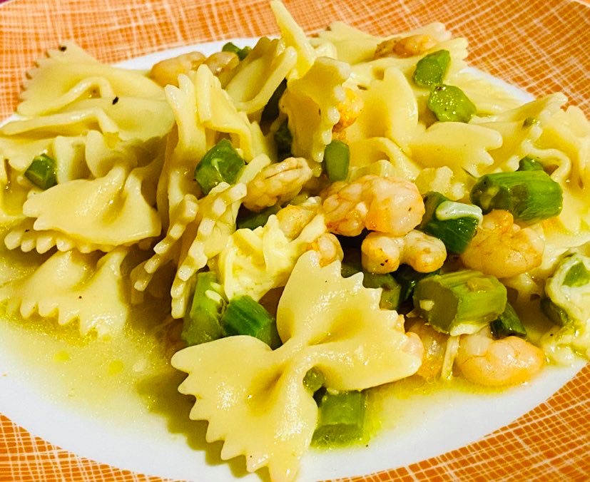 Coloque água para ferver com sal e azeite na panela.Pique o alho bem fininho. Coloque os camarões para marinar numa travessa com um cálice de vinho branco e metade do alho picado. Reserve por meia hora. Lave bem os aspargos, corte os talos (a parte mais durinha) e separe. Pique o restante dos aspargos em pedaços grandes e reserve as cabeças (serão colocadas no final) Refogue a outra metade do alho junto com os talos do aspargo. Coloque sal e pimenta-do-reino a gosto.Numa frigideira, aqueça um fio de azeite e uma colher de sopa de manteiga.Depois de alguns minutos, retire os caules (mantendo o máximo de azeite/manteiga possível na frigideira.Coloque o macarrão na água com um pouco de sal e azeite.Escorra o macarrão, misture com os aspargos, o molho e os camarões. Frite os camarões de forma que cada camarão fique em contato com o fundo da panela. Deixe os camarões dourarem e vire um a um, deixando por mais um minuto. Depois de terminar todos os camarões e reservá-los, jogue o líquido da marinada na frigideira e mexa até desgrudar aquele fundinho que se formou. Misture até reduzir esse caldo. Adicione o restante do aspargos, mexa por meio minuto e desligue o fogo.