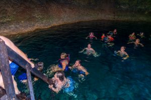 Entre Playa del Carmen e Tulum está um dos maiores cenotes da região. Tem mais de 40m de altura, de profundidade não posso avaliar.  É uma visita rápida, pois o oxigénio dentro do cenote, tem uma proporção de 40%; entramos por uma escada de madeira que nos leva às profundezas de um poço onde mergulhamos e nadamos, numa água fresca, que compensa o calor fora do cenote; não temos consciência da sua profundidade, permanecemos por pouco tempo e depois temos de sair, porque a falta de oxigénio começa a sentir-se, pelo que deve ser acompanhada por guias, não esquecendo que devemos fazer-nos acompanhar de coletes.
