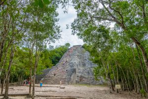 A cerca de 50 quilómetros de distância de Tulum e da costa das Caraíbas, encontram-se as ruínas da antiga Cidade Maya de Coba. A partir do período clássico tardio, de 500 a 900 D.C. A cidade estende-se ao longo de quase 70 quilómetros quadrados. Pode ter sido habitada por mais de 50.000 pessoas.   A  escalada desta íngreme pirâmide, para chegar ao  topo , é uma aventura por conta própria mas recompensada por uma vista espectacular sobre a densa floresta tropical.