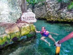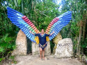 Xcaret é o parque natural que não pudemos perder no México com mais de 50 atrações para toda a família. Nadamos no rio, cerca de 1 Km, subterrâneo que nasce do coração da terra. Nunca pensei conseguir nadar tanto tempo seguido, uma aventura fantástica. Observamos de perto os habitantes do Aviário, vários papagaios, o Aquário de Recifes de Coral e o Borboletário. Almoçamos deliciosos pratos típicos Mexicanos. Fizemos uma viagem de barca, pelo rio do Xcaret, onde desfrutamos de uma tranquilidade relaxante provocada pelo clima do espaço em si. Visitamos vestígios arqueológicos maias, como uma casa Maia, e no fim do dia foi apresentado um espetáculo sobre a cultura e o Povo Maia, o que anteriormente o Miguel Castela ja me tinha explicado toda a historia deste povo. Este espetáculo fez muito sentido após ter escutado todos os conhecimentos do Miguel,  fiquei animada com a apresentação do Xcaret México Espetacular.