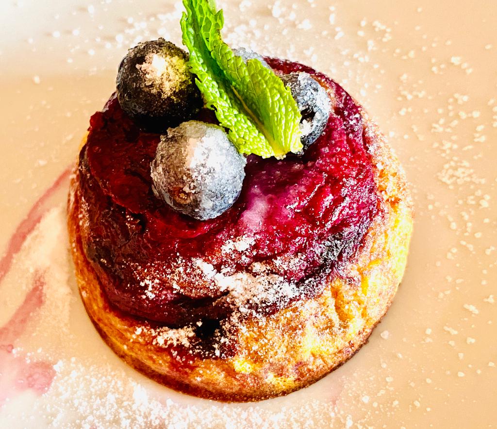 Coloque as natas com o queijo, os ovos, adoçante, as amêndoas e o extrato de baunilha, numa liquidificadora misture até obter um creme bem cremoso, junte os mirtilos e as amêndoas ao creme, e leve ao forno a 180 graus por 15 a 20 minutos até estar confecionado. Sirva acompanhado de um batido de frutos vermelhos.