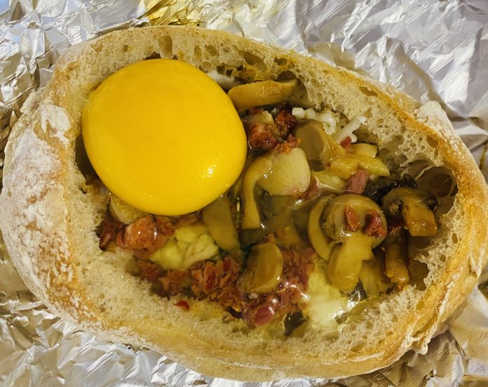 Pré-aqueça o forno a 190º C. Saltei o chouriço no azeite fomos cogumelos e os alhos picados numa frigideira até ficar no ponto. Coloque os pães sobre folhas de papel de cozinha dentro de um tabuleiro. Corte a parte de cima dos pães e retire-lhes o miolo. Comece por pôr uma camada de queijo mozzarella no fundo de cada pão. A seguir coloque coloque o preparado por cima do queijo. Depois, abra um ovo para dentro de cada pão e tempere com sal e pimenta. E leve ao forno durante cerca de 20 minutos cada pão deve estar enrolado em papel de alumínio até os ovos ficarem cozinhados ao seu gosto.