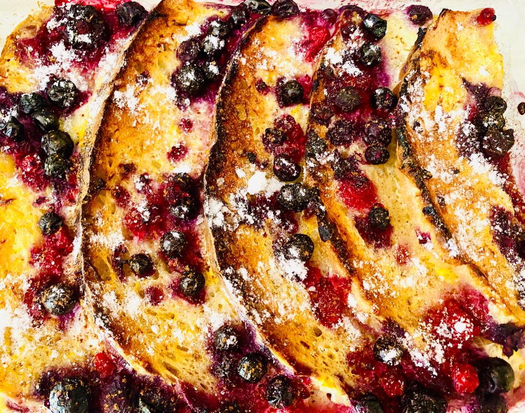 Bata 2/3 ovos num prato e junte ao leite devagar com ajuda de uma vara de arames para os ovos não cozerem. E despeje sobre o pão dentro do tabuleiro. E leve ao forno pré-aquecido (185ºC) num tabuleiro untado com manteiga, até ficarem douradinhas.