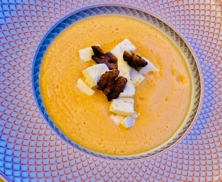 Retire as sementes descasque a papaia e retire a polpa da papaia para uma taça, junte iogurte e o mel. Misture tudo e triture com a varinha, na bimby 1 minuto vel. 9 ou num liquidificador. Reserve no frio. Corte o queijo em cubinhos. Disponha num prato de forma harmoniosa. Coloque um cordão de mel e rosmaninho. Polvilhe com nozes picadas fritas em óleo de coco, e anis. Leve o óleo de coco ao fogo com anis, junte as nozes e frite-as pó 2 minutos, cuidado para não deixar queimar.