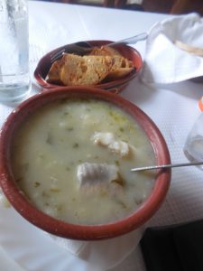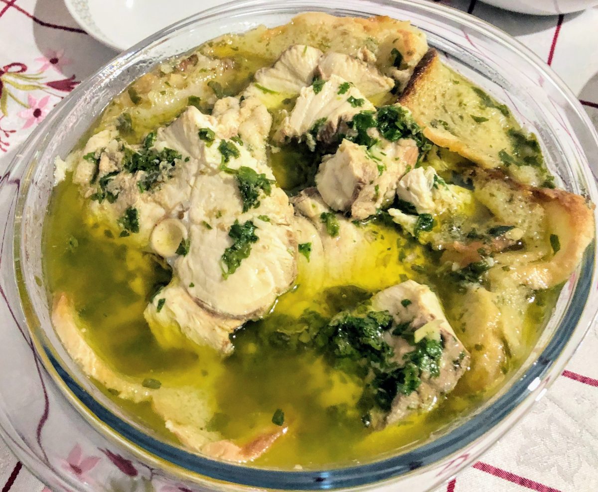 Misture um pouco de farinha e água, ao molho do peixe e deixe engrossar. Junte o peixe, perfume com o vinagre, sirva com pão bem fininho, torrado, ou com pão alentejano do dia anterior.
