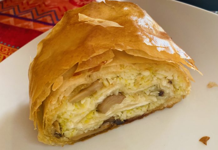 Forre uma assadeira com papel vegetal. Pincele três folhas de massa filo com manteiga e coloque-as em cima umas das outras. Por cima, espalhe a mistura dos cogumelos e alho francês e o queijo feta esfarelado. Cubra com as restantes três folhas de massa filo, igualmente pinceladas com manteiga.